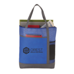 The Chrome Non-Woven Zippered Convention Tote features a mesh side accent pocket and zippered main compartment.