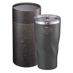 Do not miss the most trendy tumbler of the year. Durable, double-wall stainless steel vacuum powder coated, construction with copper insulation, which allows your beverage to stay cold for 24 hours and at least 8 hours for hot beverages. The construction also prevents condensation on the outside of the tumbler. Push-on two piece lid with Tritanâ„¢ swivel closure, pinch the 2 axis joints slightly to remove the top part of the lid for easy cleaning. Wide opening for comfortable filling and pouring. Design features the spinning, geometric bottom. Leed's Exclusive. 20oz. 1626-95. Laser engraving silver Drinkware will result in a subtle, tone on tone decoration
