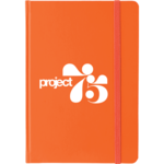 The 5" x 7" Large Rainbow Notebook includes an 80 white ruled page notebook with an elastic closure and a matching color ribbon bookmark.